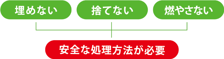 焼却処分ではCO2やダイオキシンの発生により地球温暖化、大気汚染がさらに悪化。埋め立てでは埋立地の飽和化と土壌汚染が問題となり、どちらの方法でも将来的な二次汚染が懸念されています。また、東日本大震災など、大規模災害の被災地においても処理物の保管場所等、さまざまな問題が山積しています。