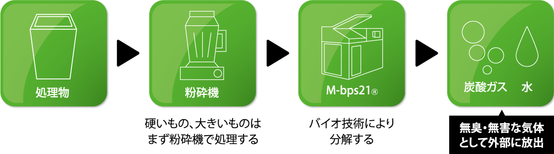 菌床(セラミック)は多孔質で作られており、この無数の孔の中に、複合の微生物が群衆して棲息しています。処理物などの有機物が菌床に接触すると、この処理物を栄養源として菌床中の複合微生物群集が急激に繁殖し、処理物等はセルロース化し「アミノ酸」、「アルコール」や「糖質」などに分解され、さらには、発酵分解により最終的にはその構成物のほとんどが水分と気体(炭酸ガス)に分解されます。また、菌床自体は腐敗することなく、バイオ分解の活動を維持し続けます。このように、自然界における微生物による有機物の浄化システムを実現した画期的な処理システムが「M-bps21Ⓡ(マップス21)」なのです。